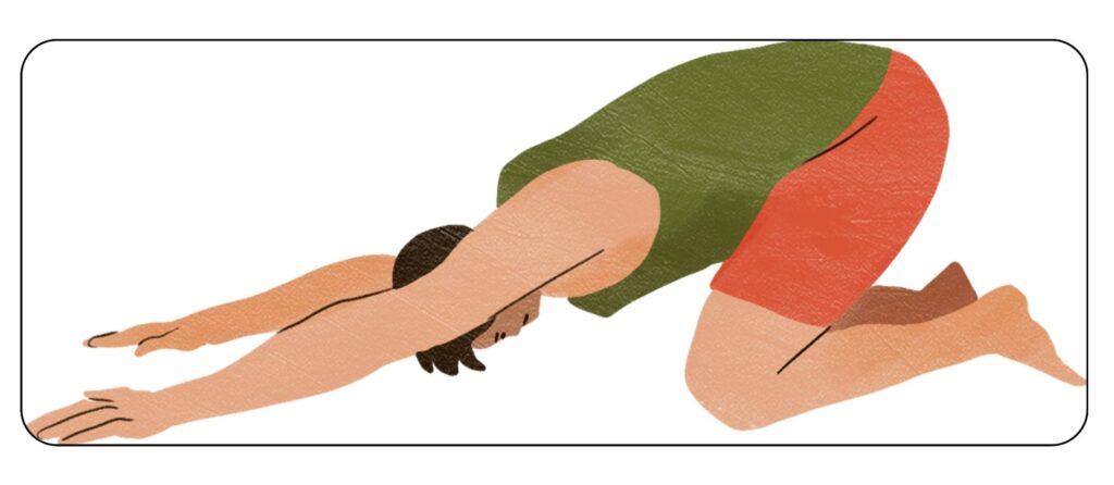 2. Gently lean back onto your heels and stretch your arms out in front of you, resting your forehead on the ground.
