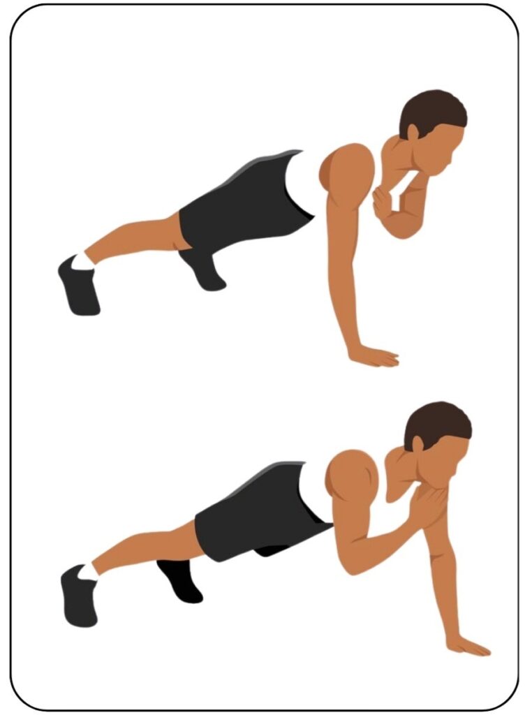 Knee push ups: Keep your body straight from your head to your knees, with your elbows bent at about a 45-degree angle as you lower your chest towards the floor and then push back up.